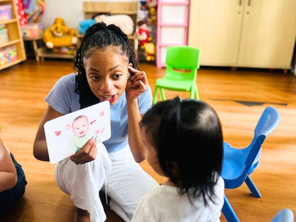 Get involved in play-based learning—singing songs, reading simple stories, helping with crafts, and joining in games that introduce basic English in a fun way.
